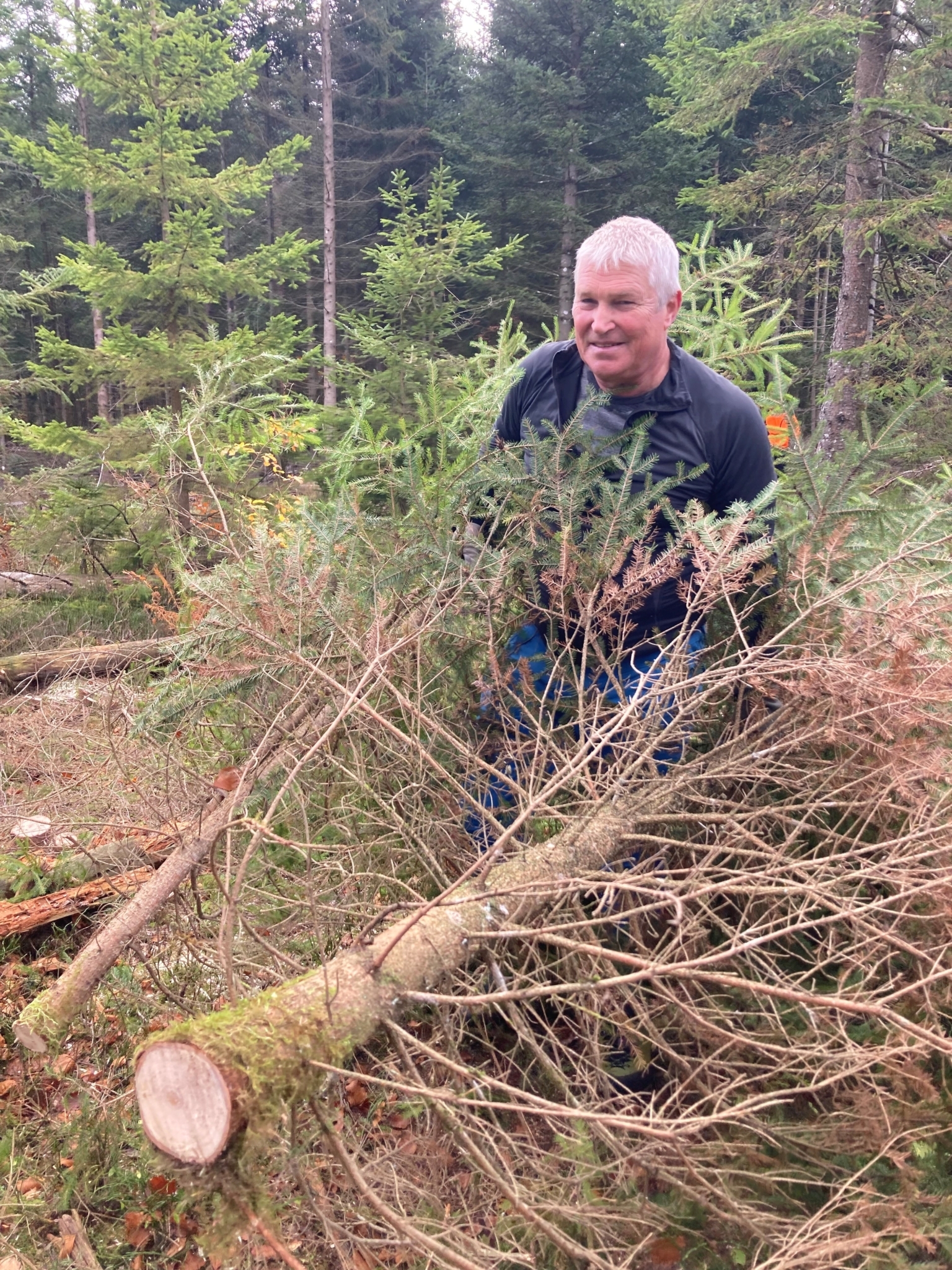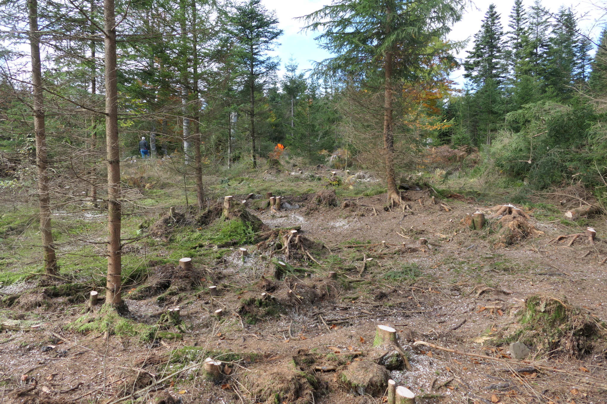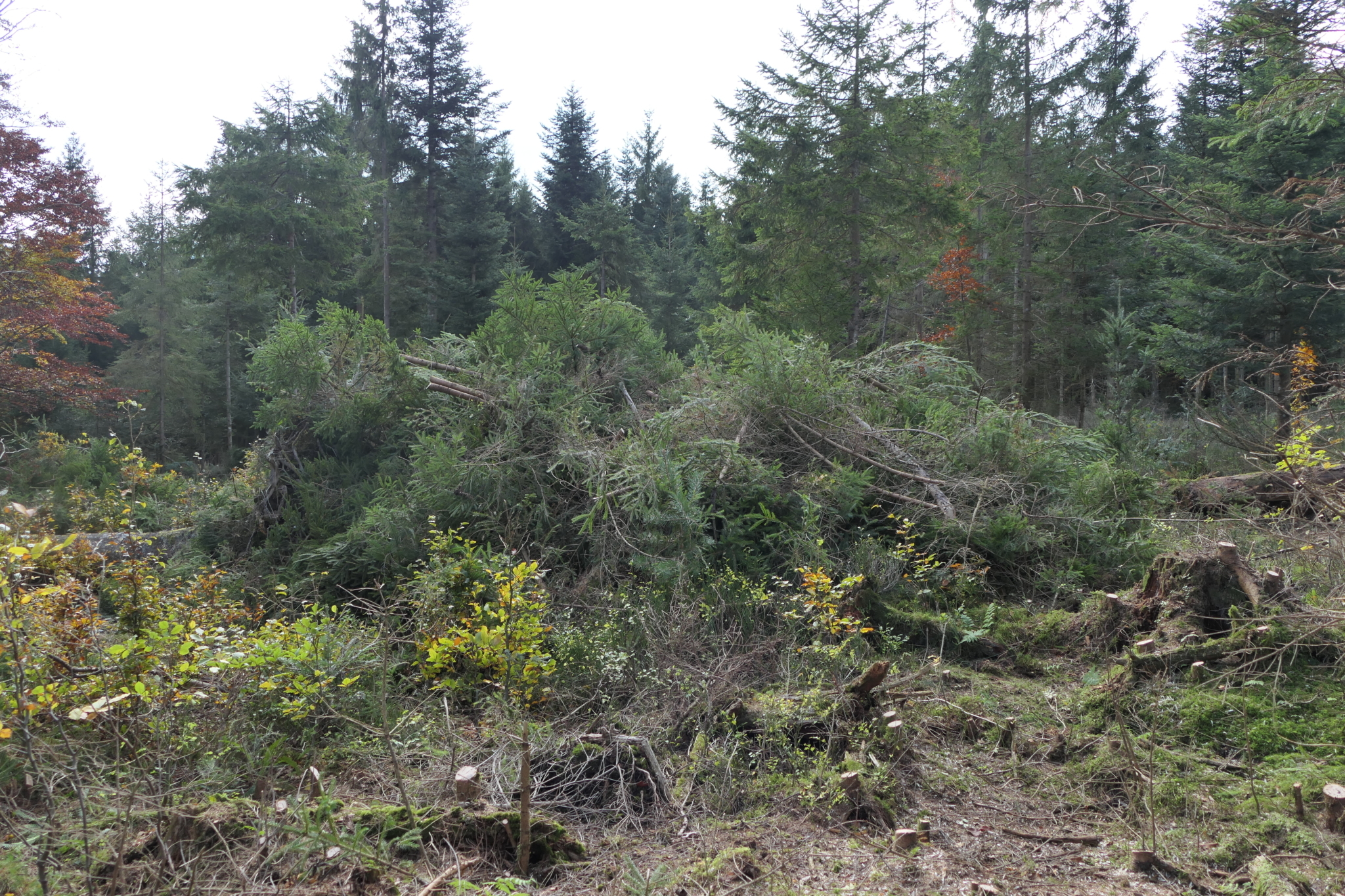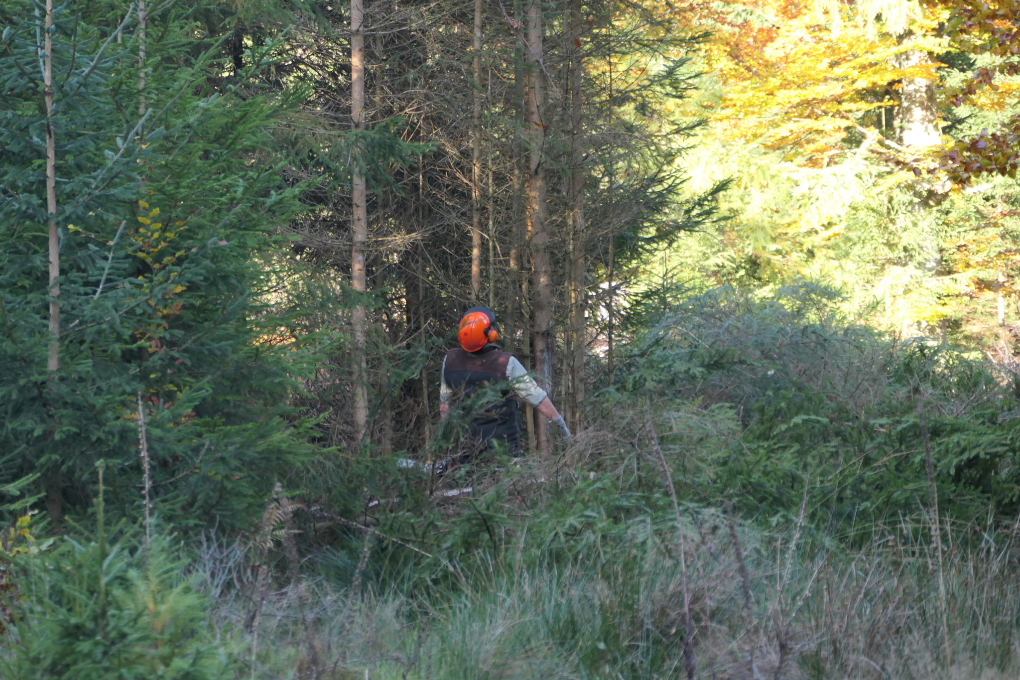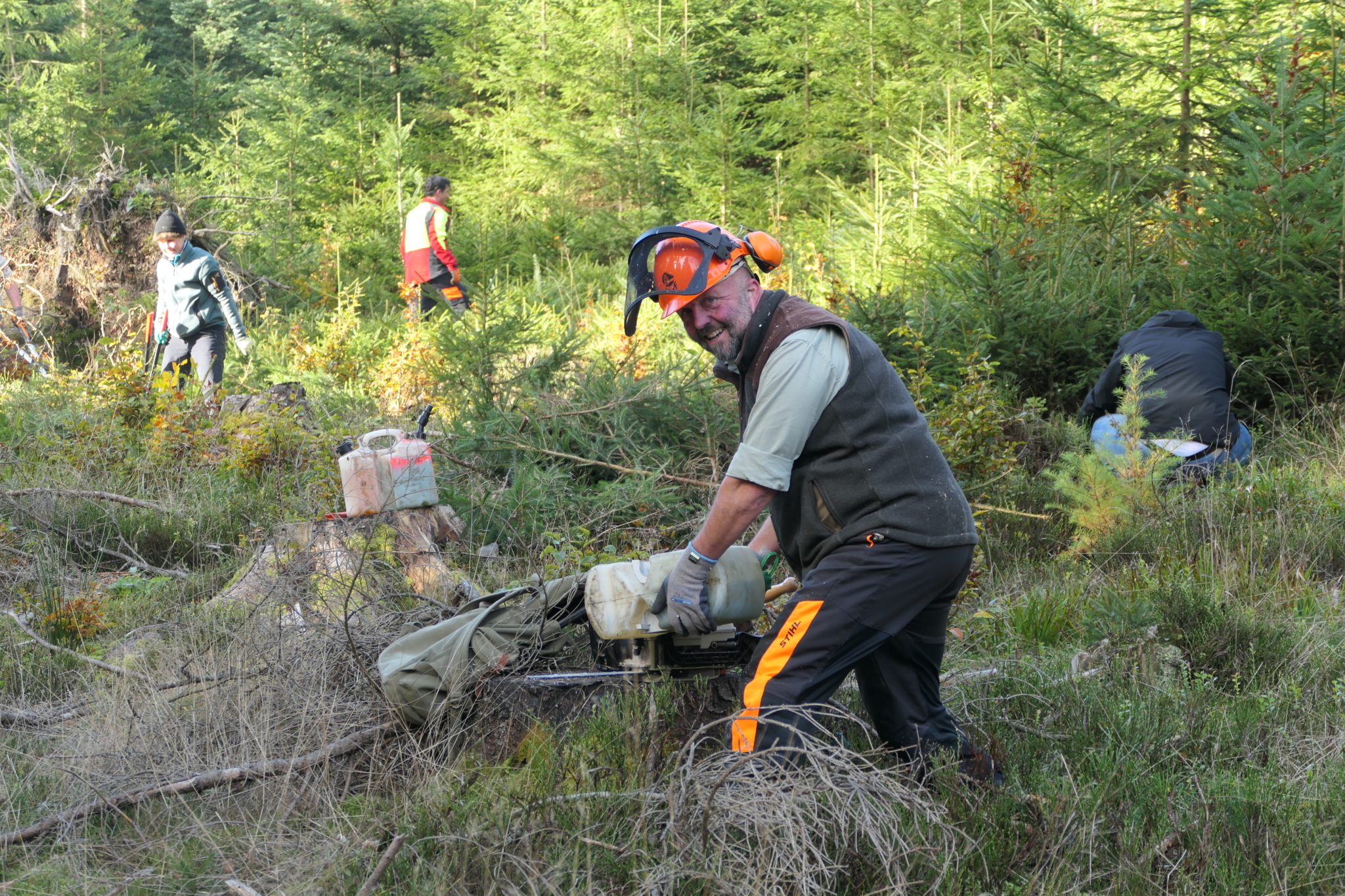 An anderer Stelle wurde eine Fichtendickung mit größer gewachsenen Bäumen aufgelockert, um verschiedene Lichtungsbereiche miteinander zu verbinden. Dabei kamen sogar Kettensägen zum Einsatz, die einige Helfer mitgebracht hatten.