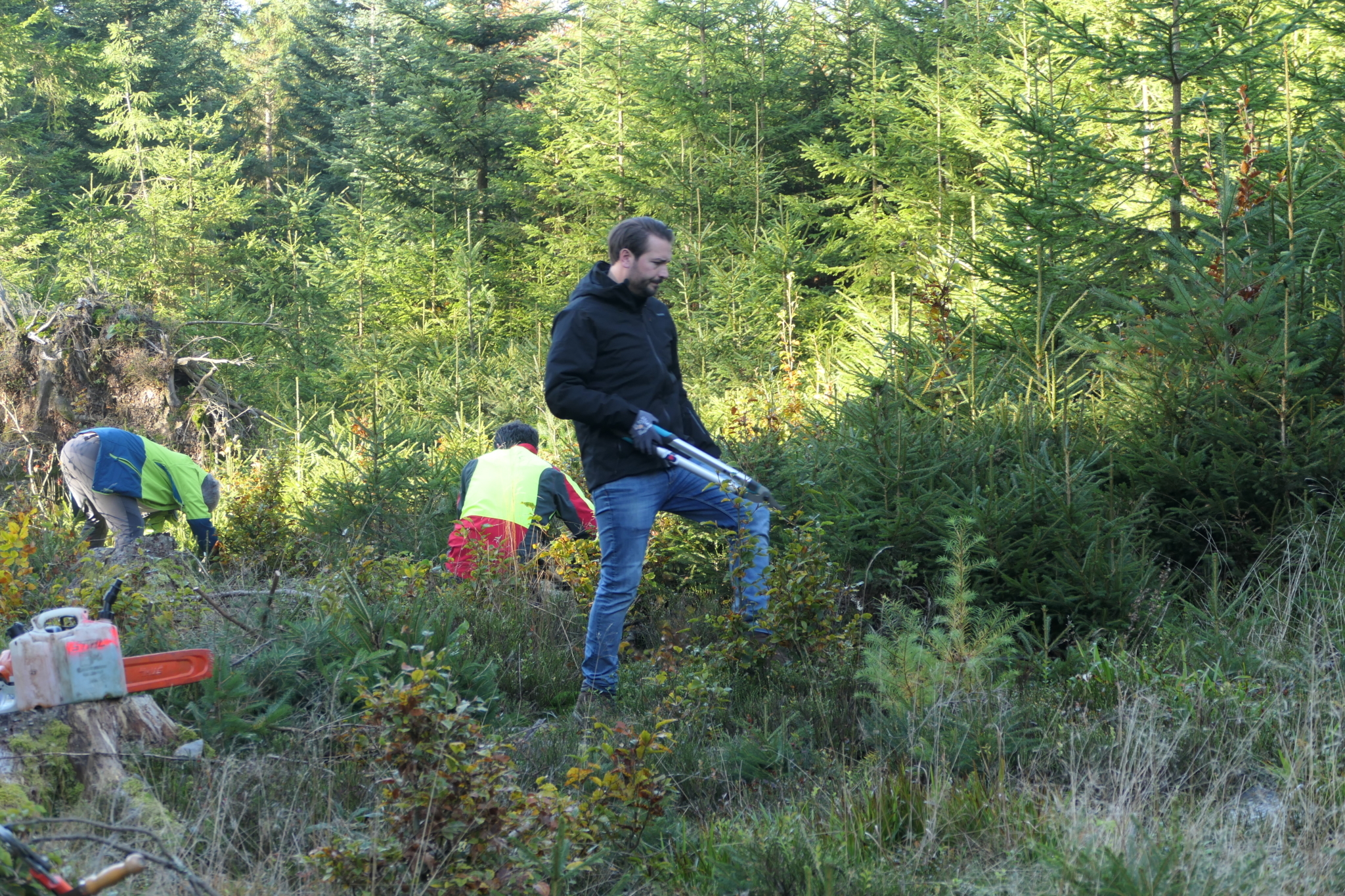 Für das Auerhuhn als Lebensraum zur Verfügung gestellt wird die Pflegefläche vom Stadtwald Freudenstadt. Dabei waren auch mit vollem Einsatz dabei der Oberbürgermeister der Stadt Freudenstadt Adrian Sonder, sowie der Forstbereichsleiter Björn Waidelich und Revierleiter Jochen Armbruster.