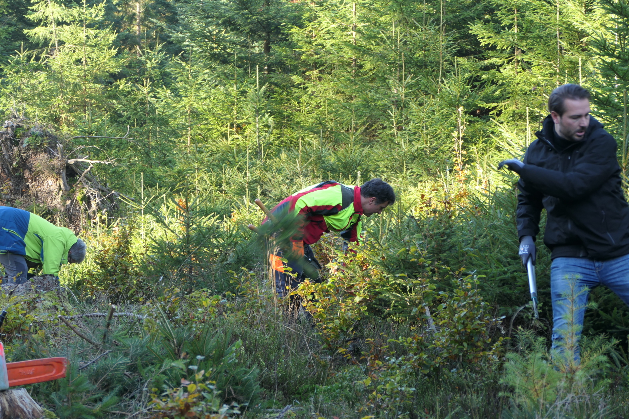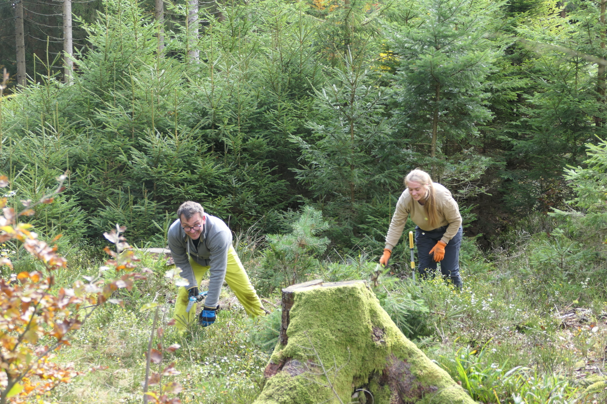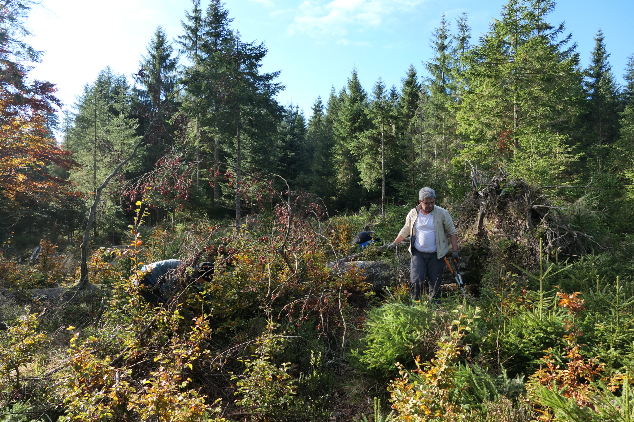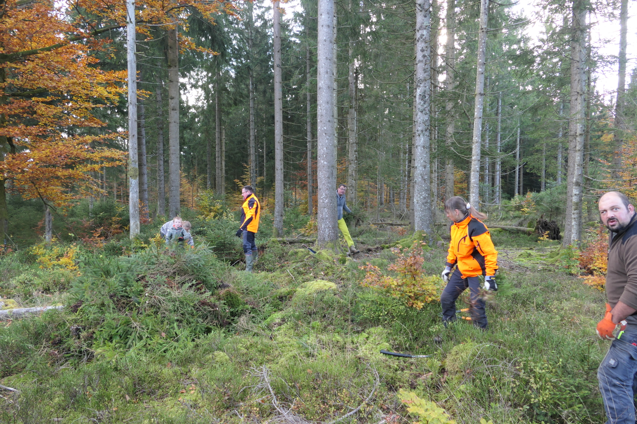 Nach der Begrüßung und Einführung ging es für das Pflegeteam direkt auf die Fläche. Da lichte Waldbereiche lebenswichtig für das Auerhuhn sind war es das Ziel eine solche Lichtung mit schönen Heidelbeersträuchern zu vergrößern. Mit Handsägen, Astscheren und teilweise mit der bloßen Hand wurde dabei die flächig aufkommende Fichtennaturverjüngung entfernt um es der reichen Kraut- und Strauchschicht zu ermöglichen sich zu etablieren und weiter auszubreiten.
