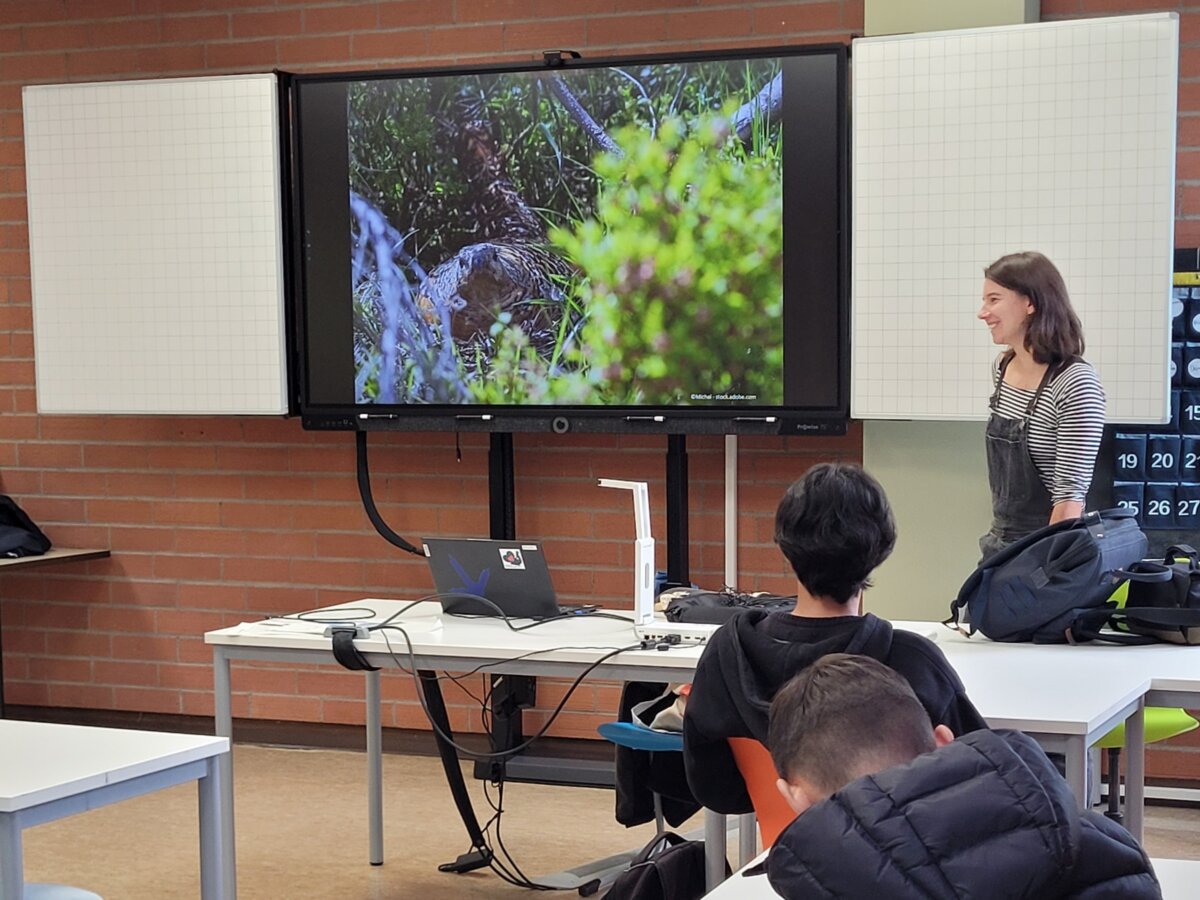 Am Mittwoch, 1. Oktober, besuchte unsere Mitarbeiterin Leonie Jurowski die SchülerInnen der Klassen VABKF1 und 1BSAV1 der Gewerbeschule Lörrach. Sie informierte die Klassen über die Lebensweise und über die aktuelle Bestandsentwicklung des Auerhuhns. Außerdem beschrieb sie, welche gemeinsamen Maßnahmen man in den kommenden Wochen auf dem Feldberg umsetzen werde. Das neue Wissen konnten die Schüler*innen wenige Tage später praxisnah bei einem Habitatpflegeeinsatz am Notschrei anwenden, in einer Fläche, für die sie vor zwei Jahren eine Patenschaft übernommen hat. Konkret geht es hierbei darum, die Lebensräume des Auerhuhns zu verbessern und wiederherzustellen.