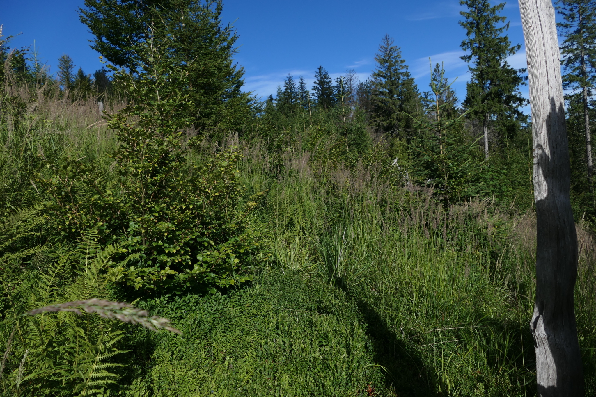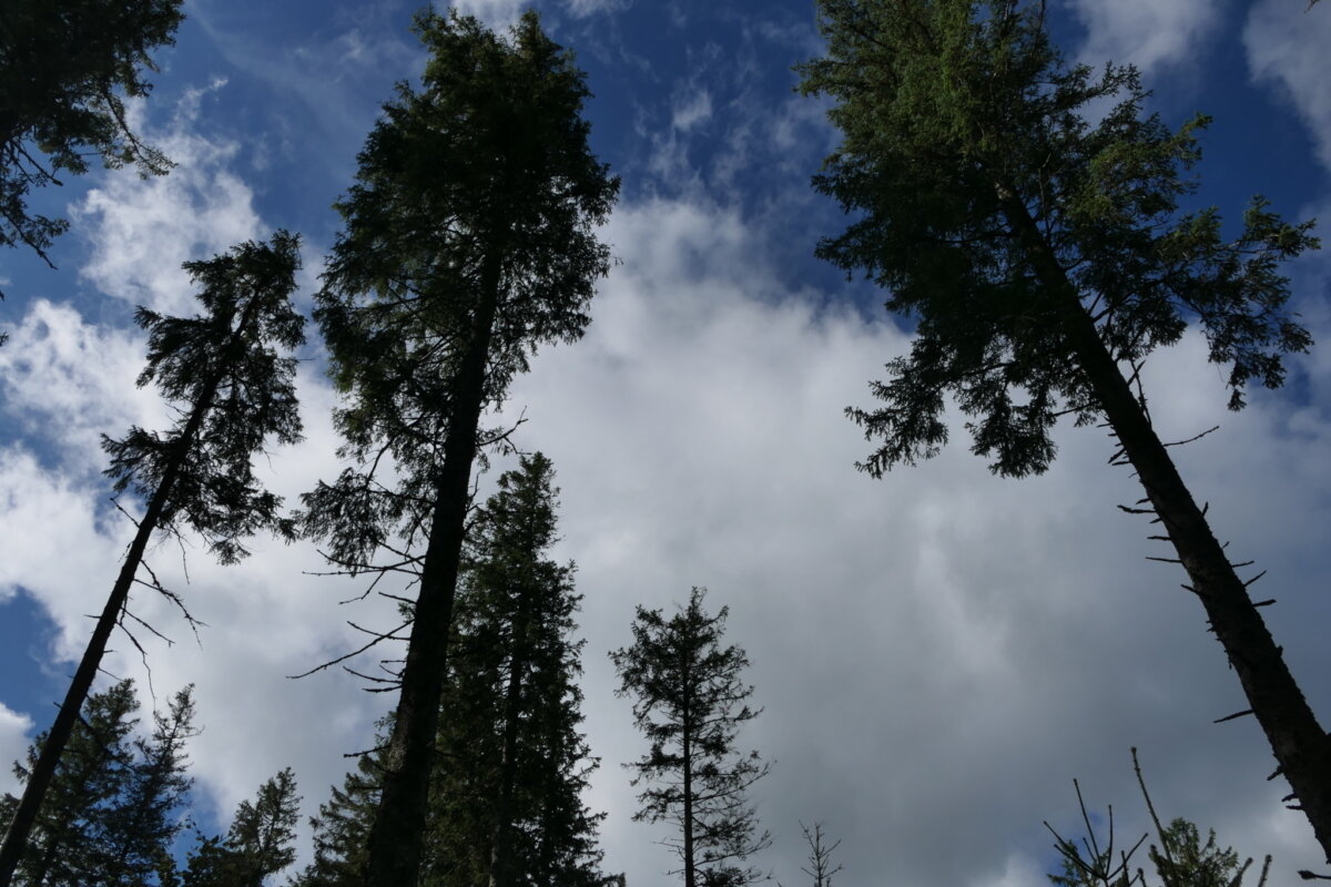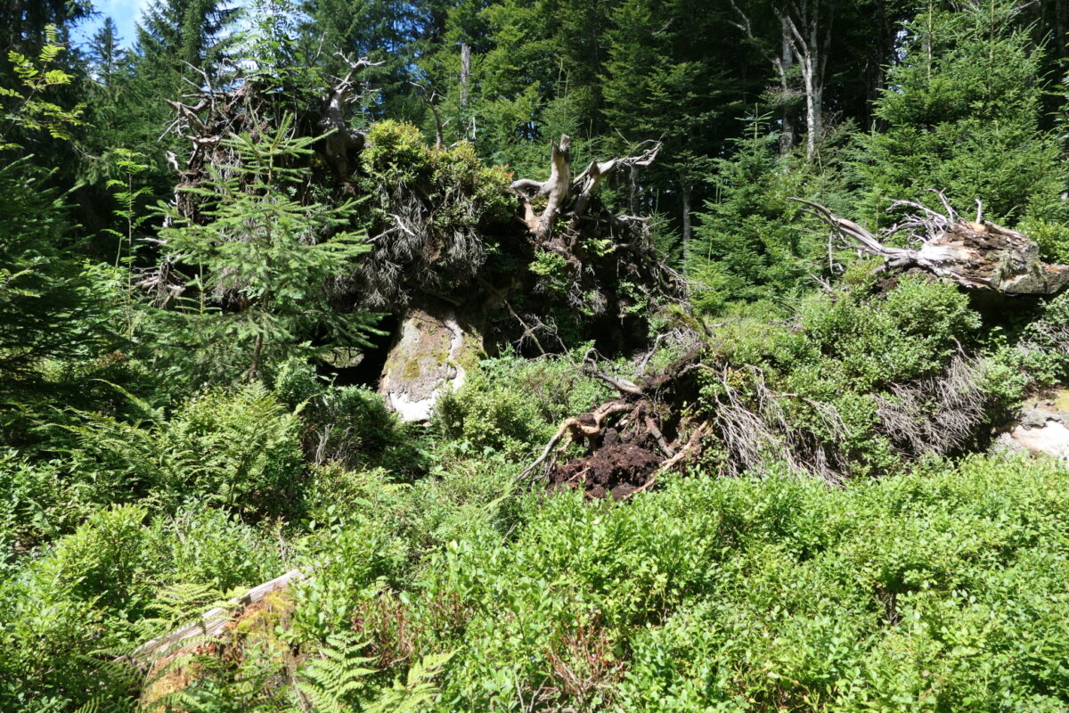 In zwei Fällen werden schöne, licht stehende Altholzbestände im Unterwuchs von der flächig dicht gewachsenen Naturverjüngung befreit. Diese dichte Unterschicht ist für das Auerhuhn undurchdringbar und verhindert die Ausbreitung einer reichen Heidelbeerschicht, dieser so wichtigen Nahrungspflanze des Auerhuhns. Es wird jedoch nicht die komplette Verjüngung entfernt. Immer wieder werden Grüppchen von Jungbäumen belassen, um wichtige Deckung zu erhalten. Auch die knorrigen Altbäume werden ebenso wie das liegende und stehende Totholz auf der Fläche erhalten.