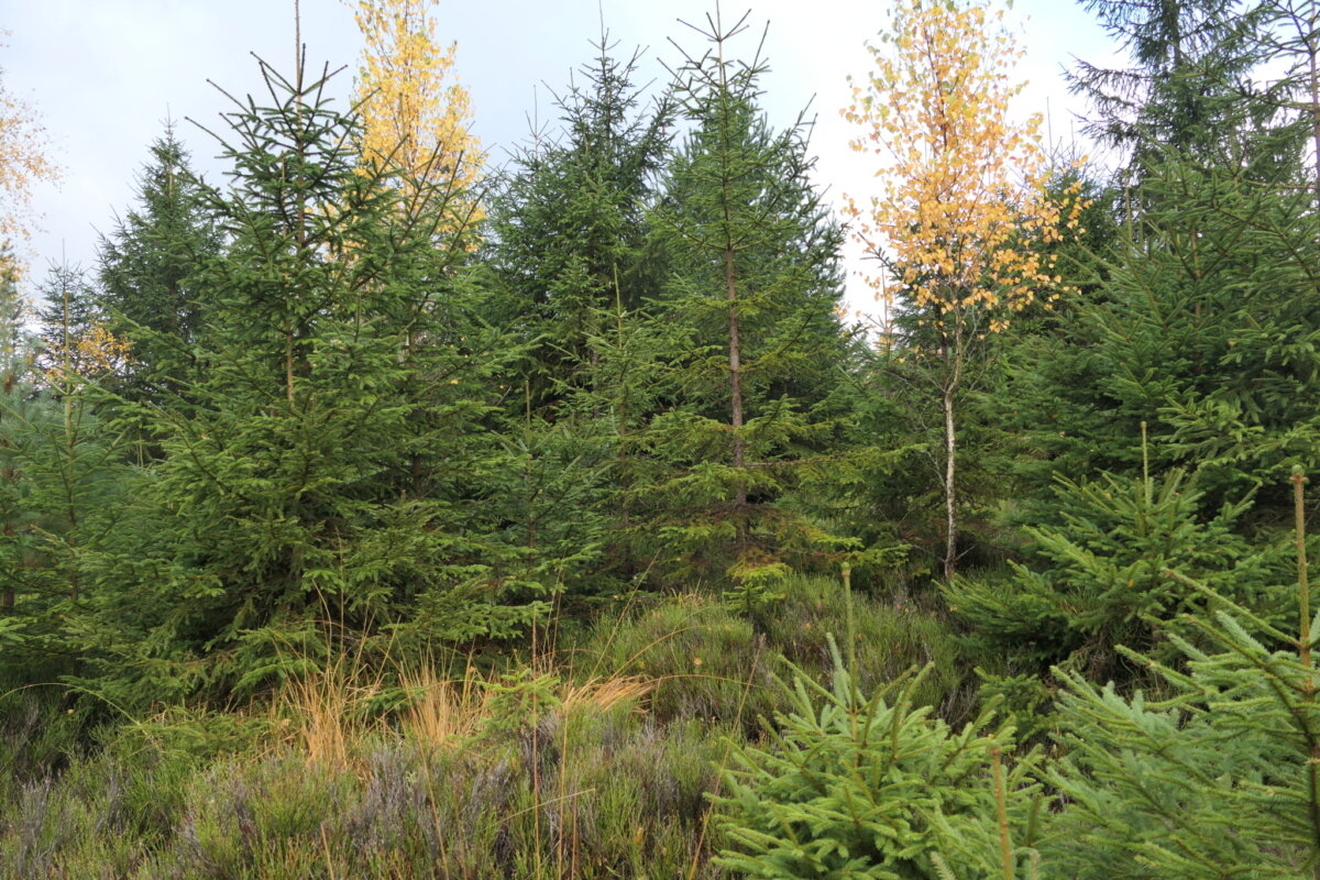 Dritte Maßnahme ist die Pflege eines Jungholzbestandes. Die dicht gewachsenen Fichten werden aufgelockert und freie Fläche geschaffen. Mit Pflegelinien werden diese freien Flächen miteinander verbunden. Die Kiefer und andere Mischbaumarten, wie die Birke und Vogelbeere werden dabei als wichtige Strukturelemente erhalten.